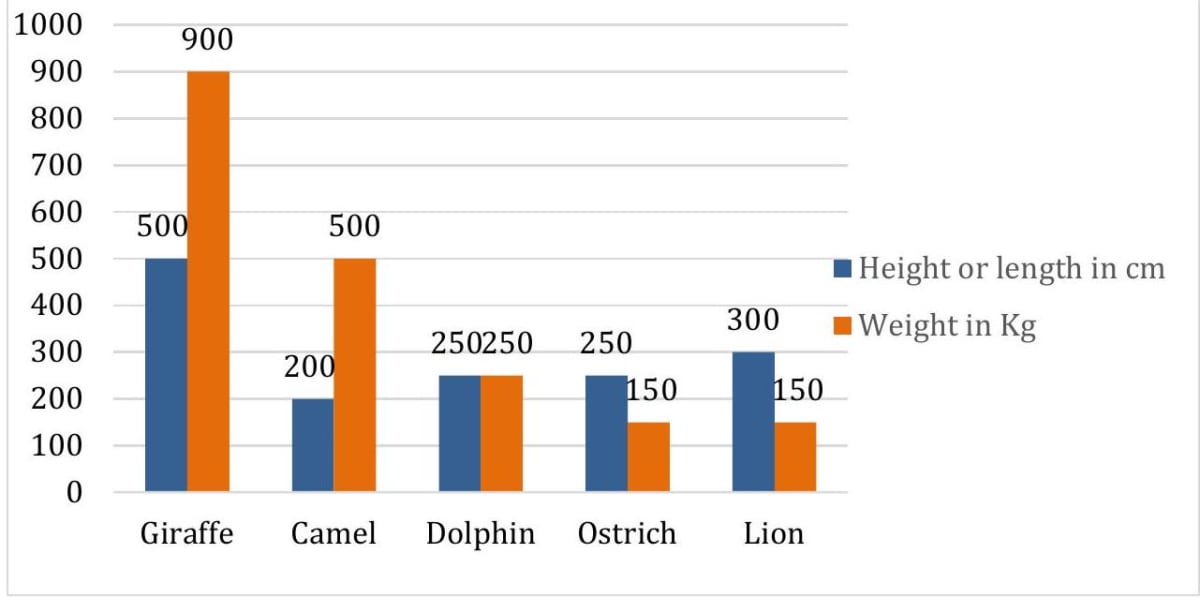 Q. The graph given below compares the heights and weights of various animals. The scale that is taken here is unit