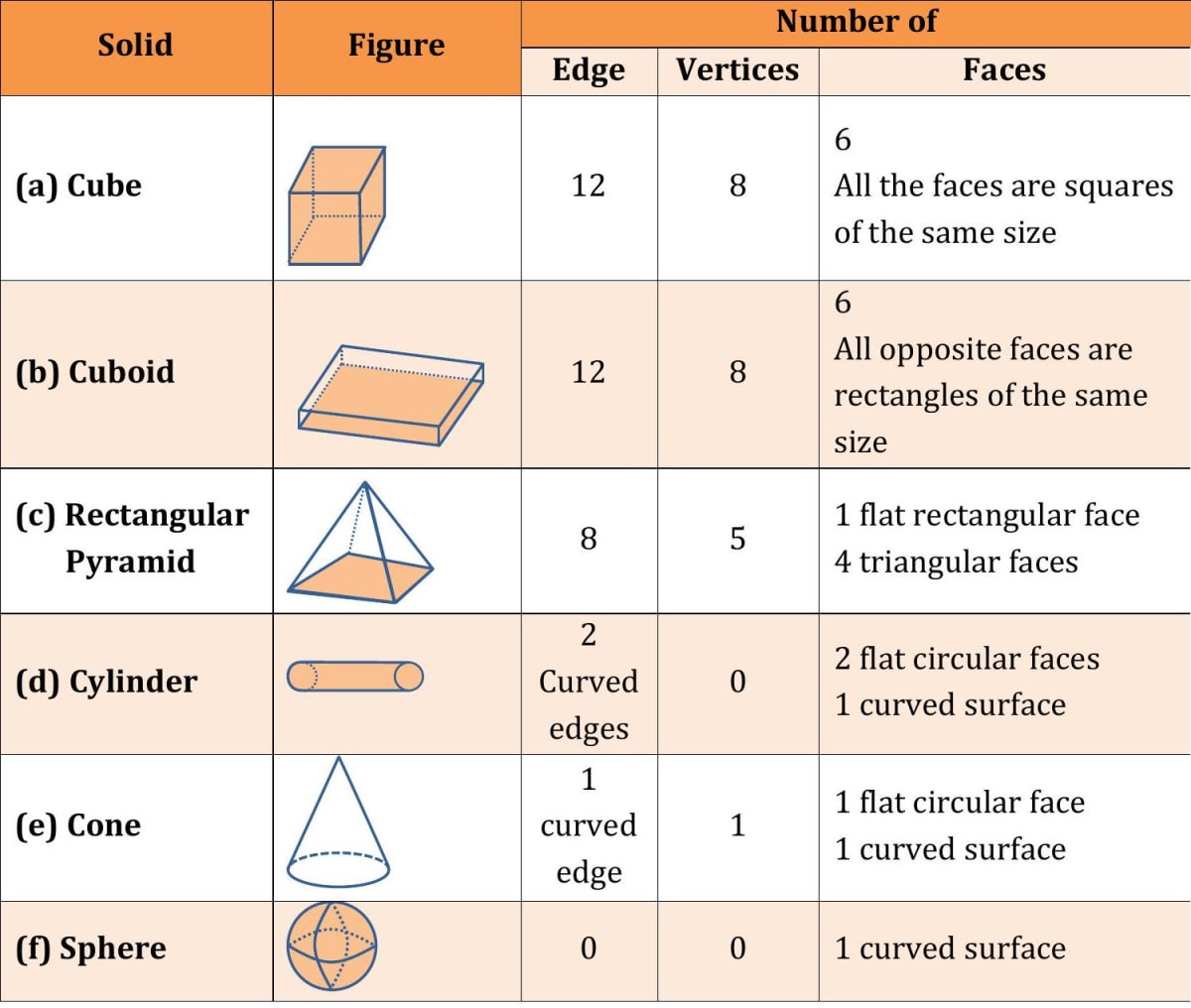 (i) Geometric solids are three- dimensional figures that have length, breadth and height. (ii) Every geometric solid has a fixed number of edges, vertices and faces. (iii) The face of a solid is a flat or curved surface that is two-dimensional in shape. (iv) Every solid has flat surfaces or curved surfaces or both types of surfaces (flat and curved). (v) A solid with all its surfaces flat is a polyhedron. Each surface of a polyhedron is called a face of the solid. (vi) An edge forms when two faces meet. (vii) The vertex is the point where three or more edges meet.