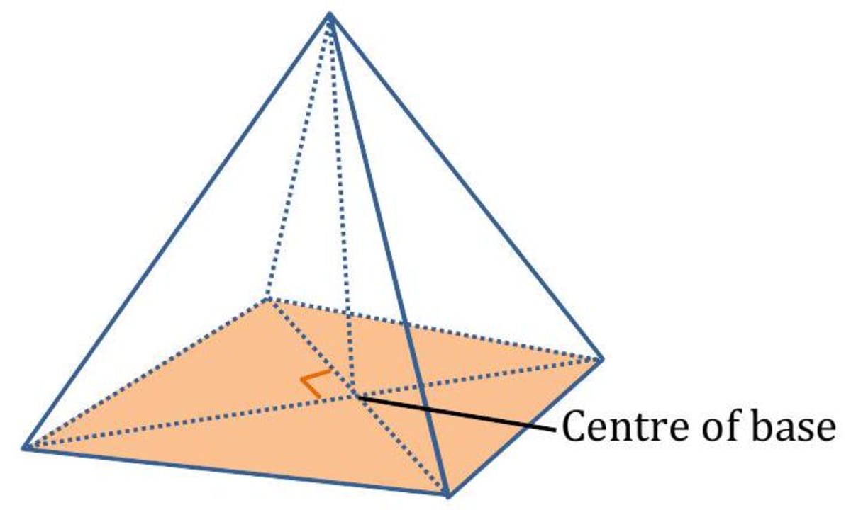(i) The lateral triangular faces meet at a common vertex. (ii) The perpendicular distance from the common vertex to the base is the height of the pyramid. (iii) A right pyramid is a pyramid in which its vertex is vertically above the centre of the base.