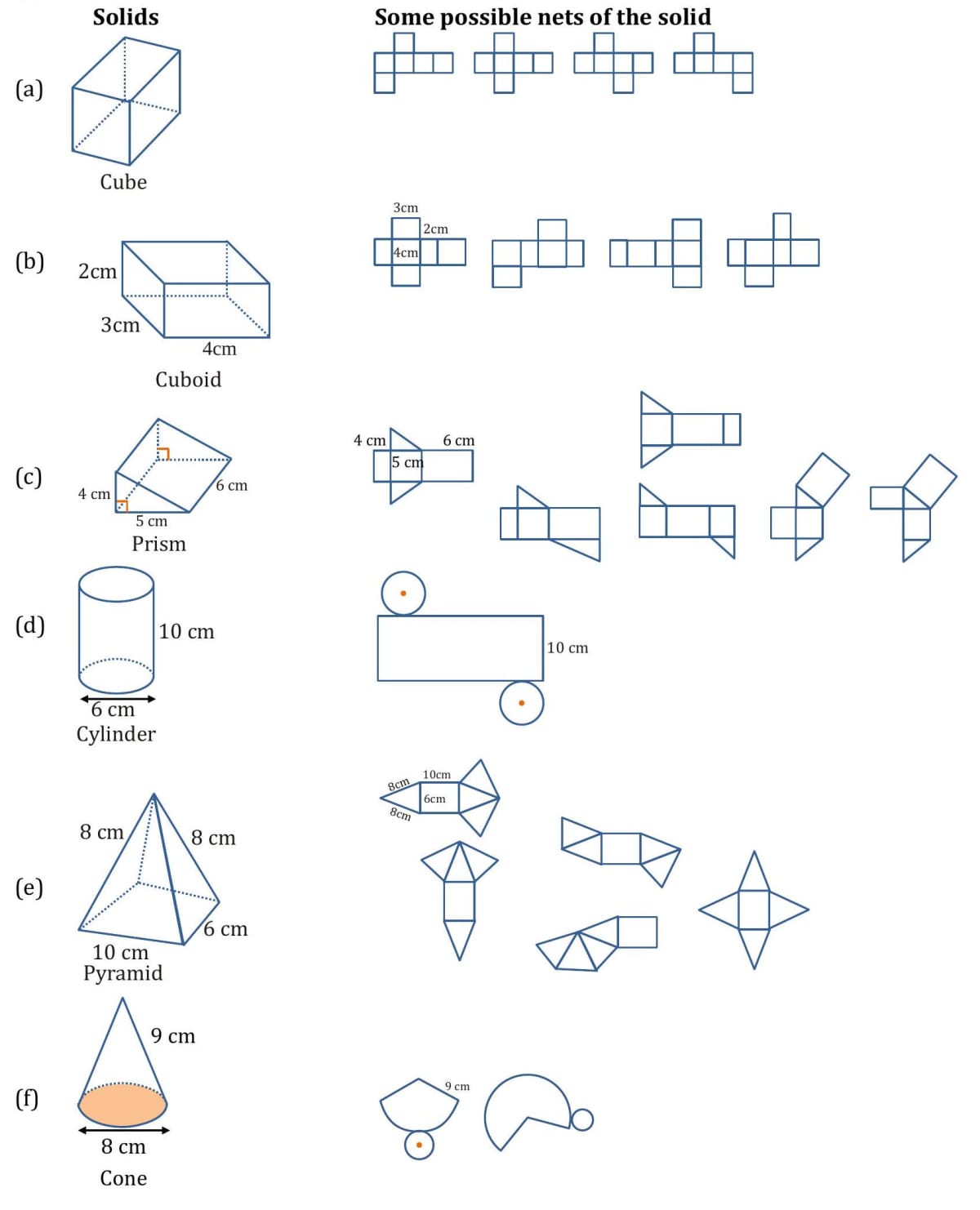 A net is a flat diagram on one plane that is folded to make a hollow solid. Alternatively, if a hollow solid is opened out, the result is its net. (i) A net is also known as a layout. (ii) The nets of a solid may have different shapes.