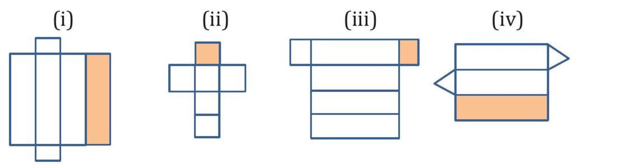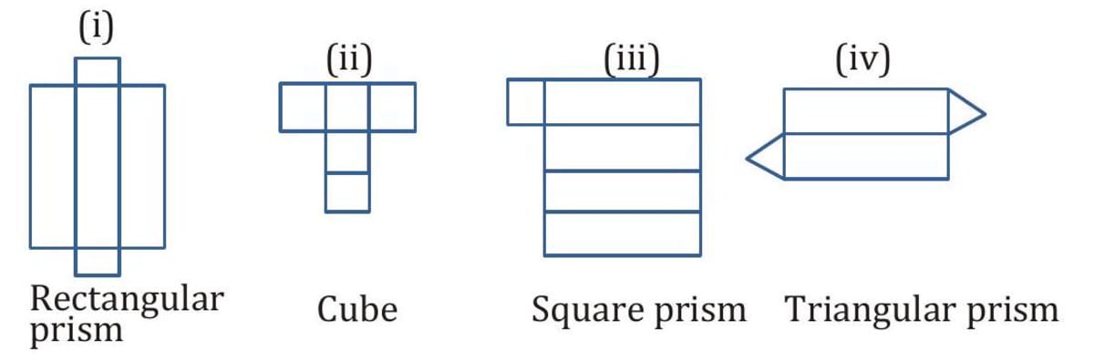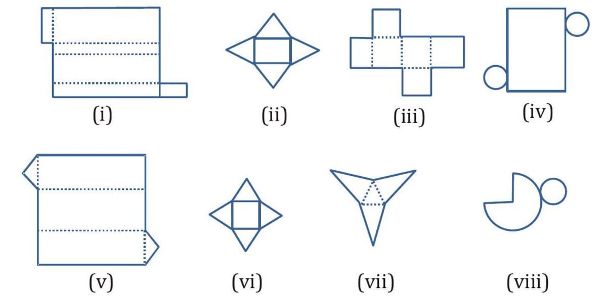 Q. Label each net as of : (i) Cuboid (ii) Cube (iii) Triangular pyramid (iv) Rectangular pyramid (v) Cone (vi) Cylinder (vii) Square pyramid (viii) Triangular prism