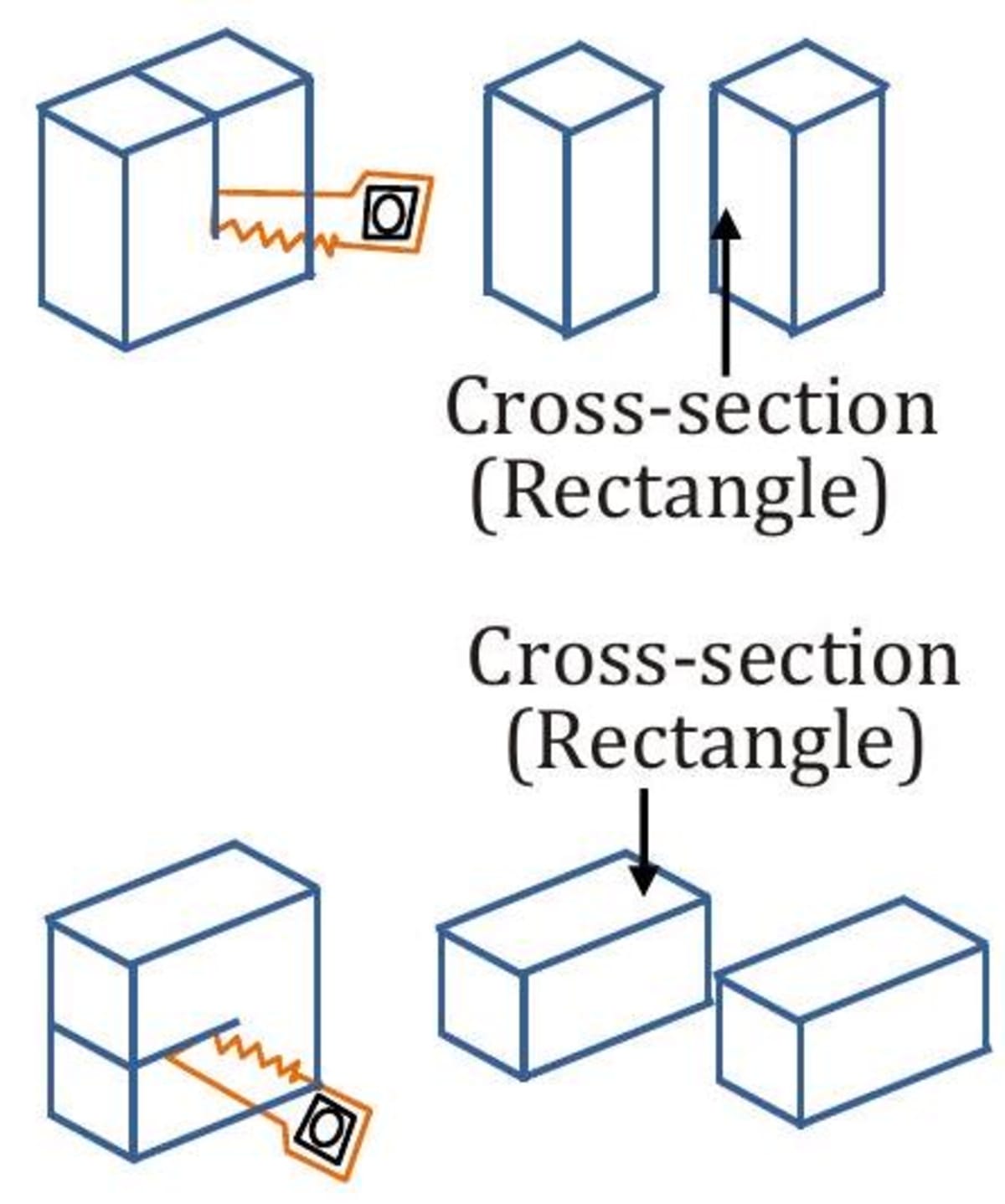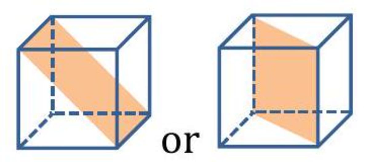 By slicing a cube in different planes, we can create differently shaped cross-sections. However, in the case of a cube both a horizontal cut, a vertical cut yield a square. As shown below, the crosssection of the horizontal and vertical cuts of a cuboid are rectangles.