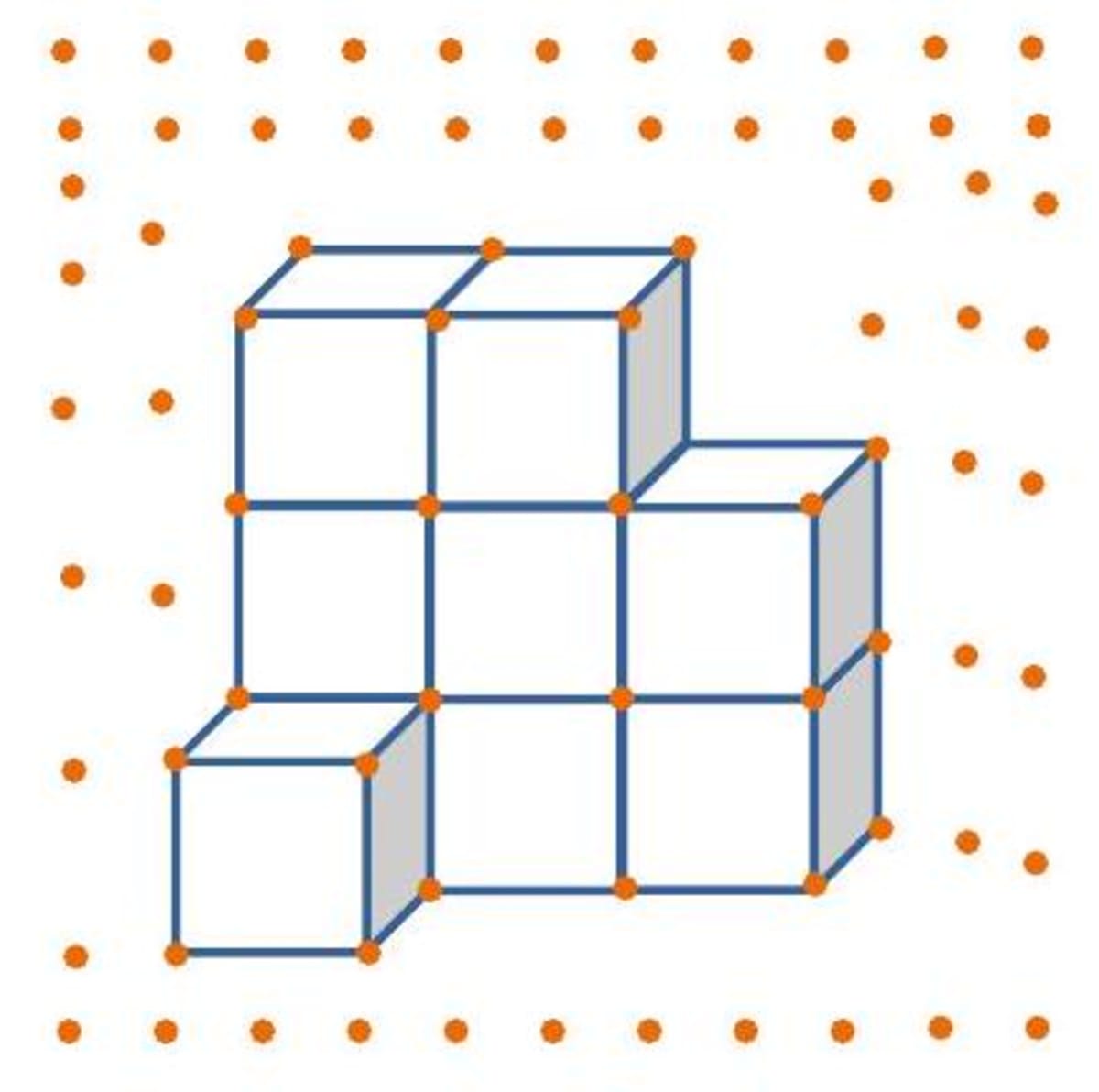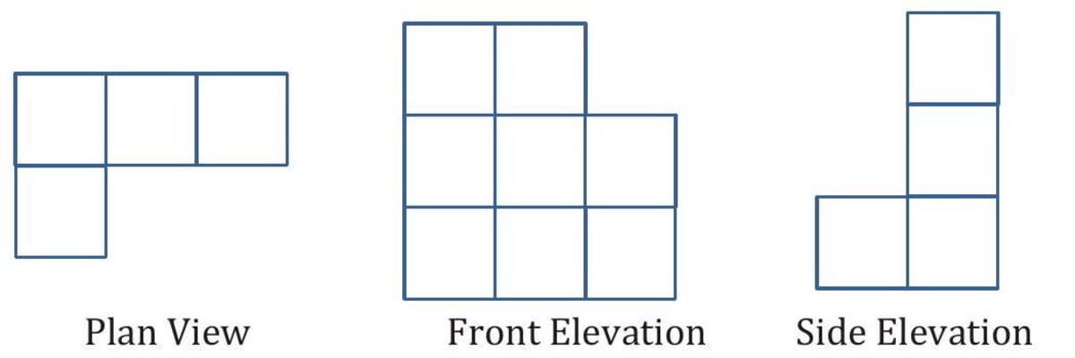 Q. The diagram given below shows a solid, made of cubes drawn on a dotted (isometric) paper. Draw its plan, front and side elevations.
